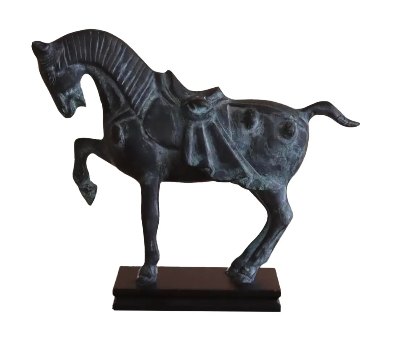1950s Dynasty Horse Statuette. Pretty green verdigris/patina. Mounted on stand.