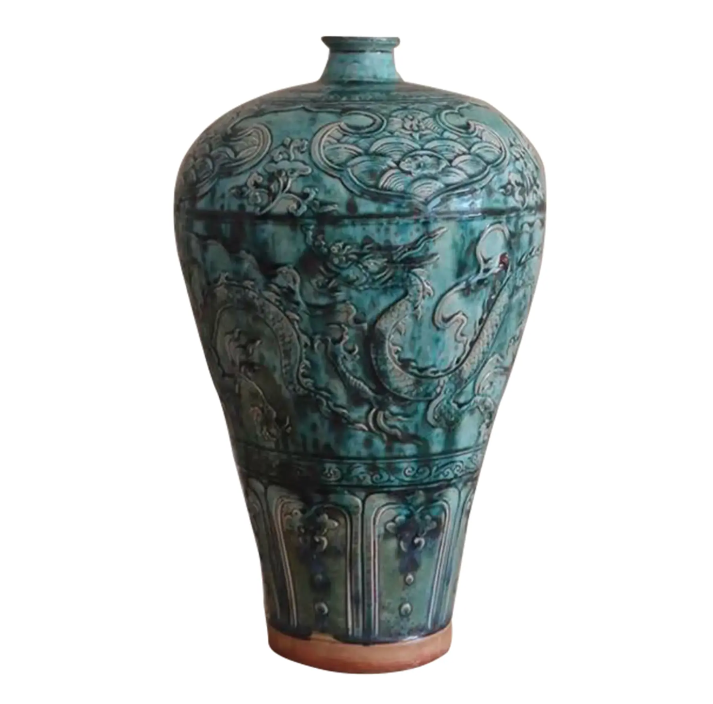 Large turquoise glaze vase decorated with dragon relief art from China. Urn silhouette with dramatic scale.