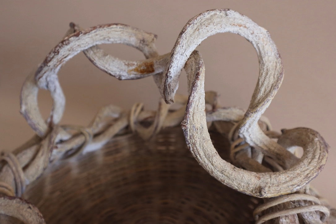 Vintage rustic woven basket with vine trained handle. Intricate and unique technique.