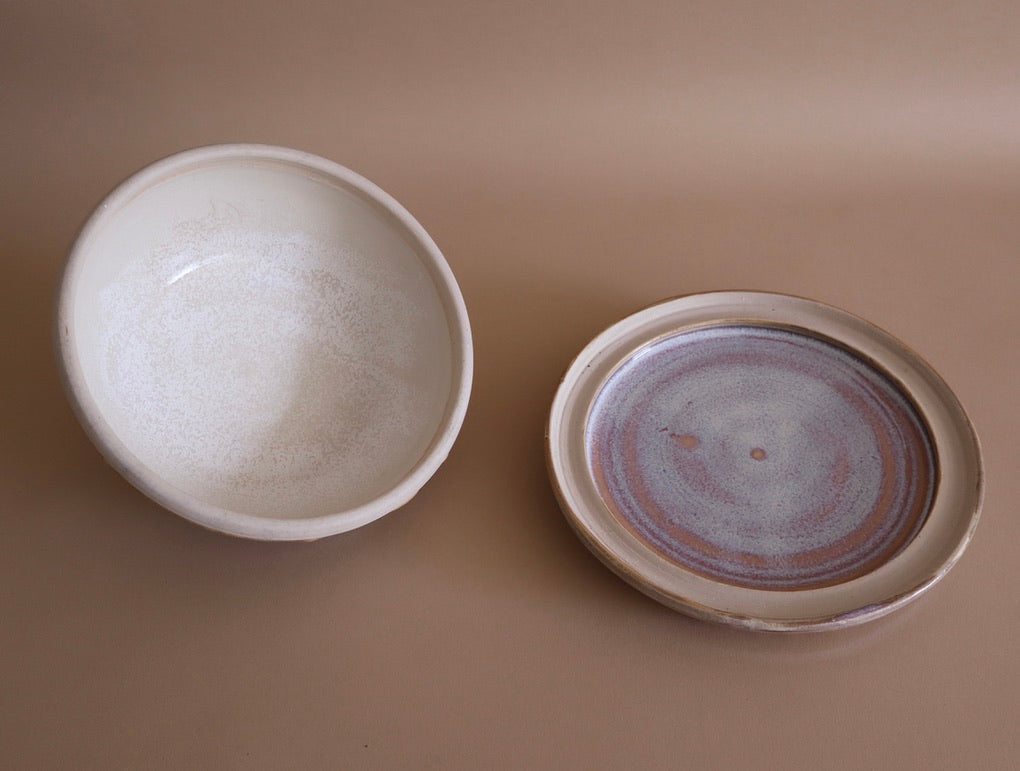 Vintage 1980s California studio handmade ceramic cloche. The star of the piece is the intricately made rope tassel handle, and rope foot around the base. Painted with glistening blue, lavender, and peach glaze. Signed by artist, Mary Wright. French country style.