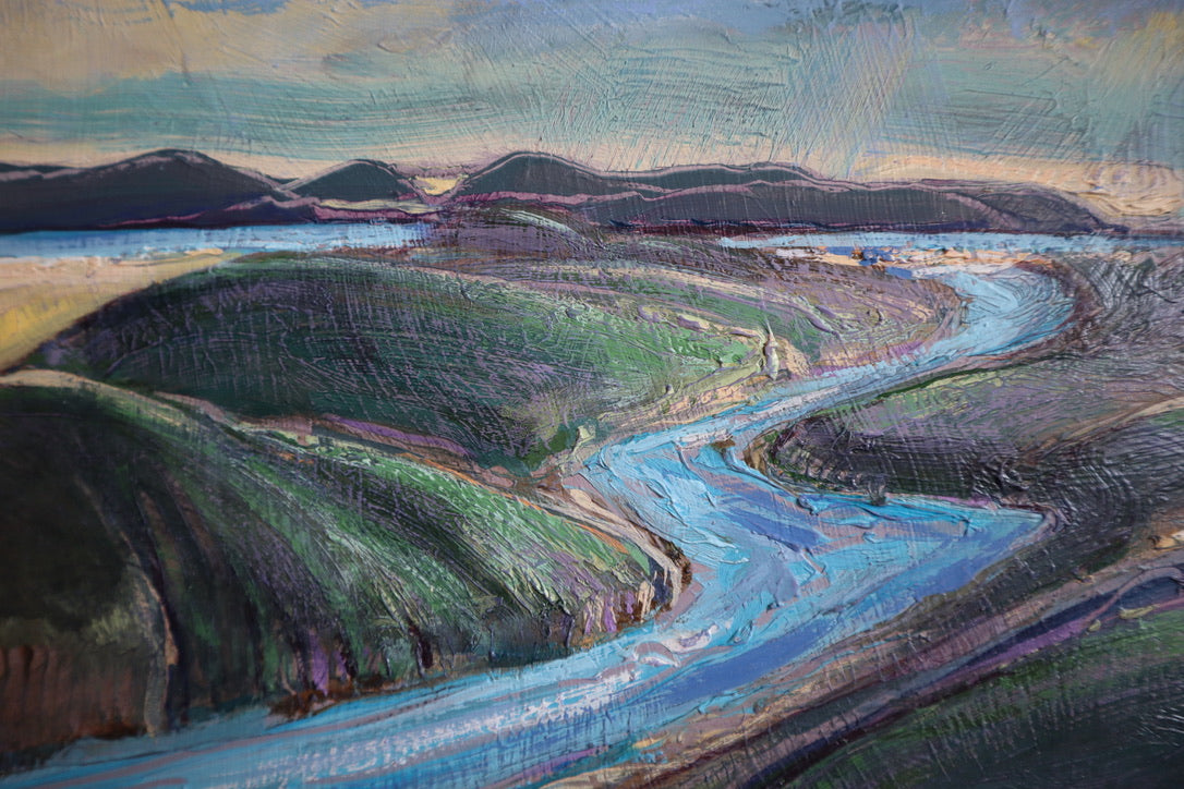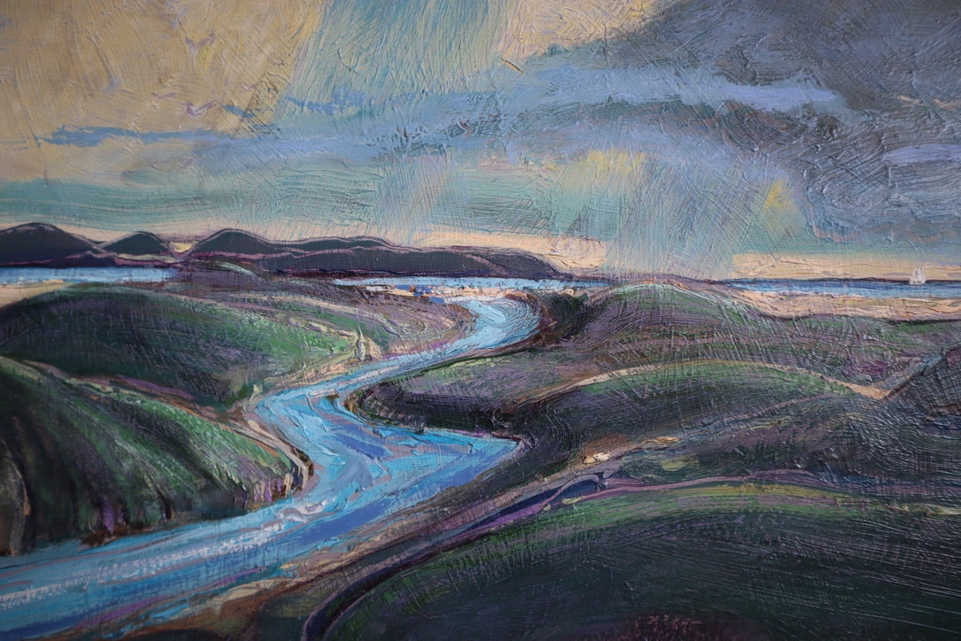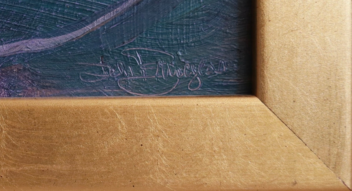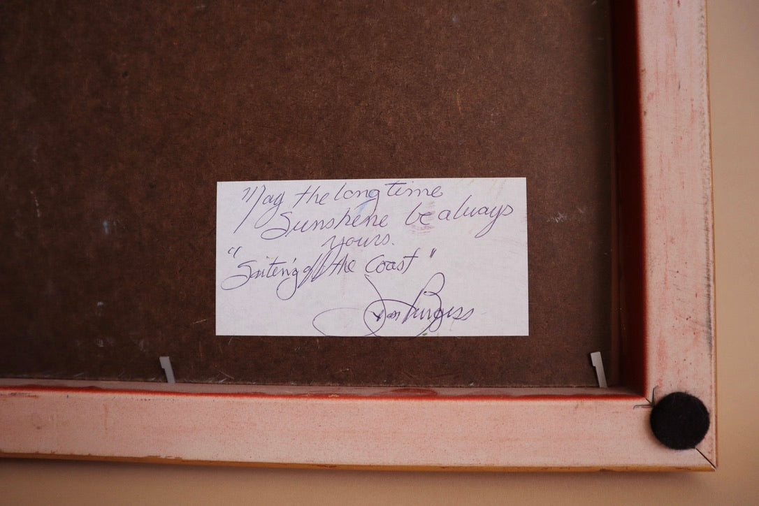Colorful, charming, and dreamy vintage coastal oil painting by Don Burgess. Framed Countryside Oil Painting by artist, Don Burgess. This painting is especially lovely as it includes a hand-written note by Don reading, "May the long time sunshine always be yours."