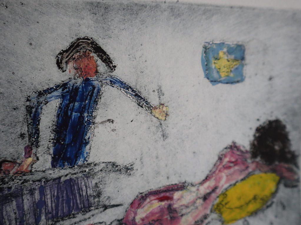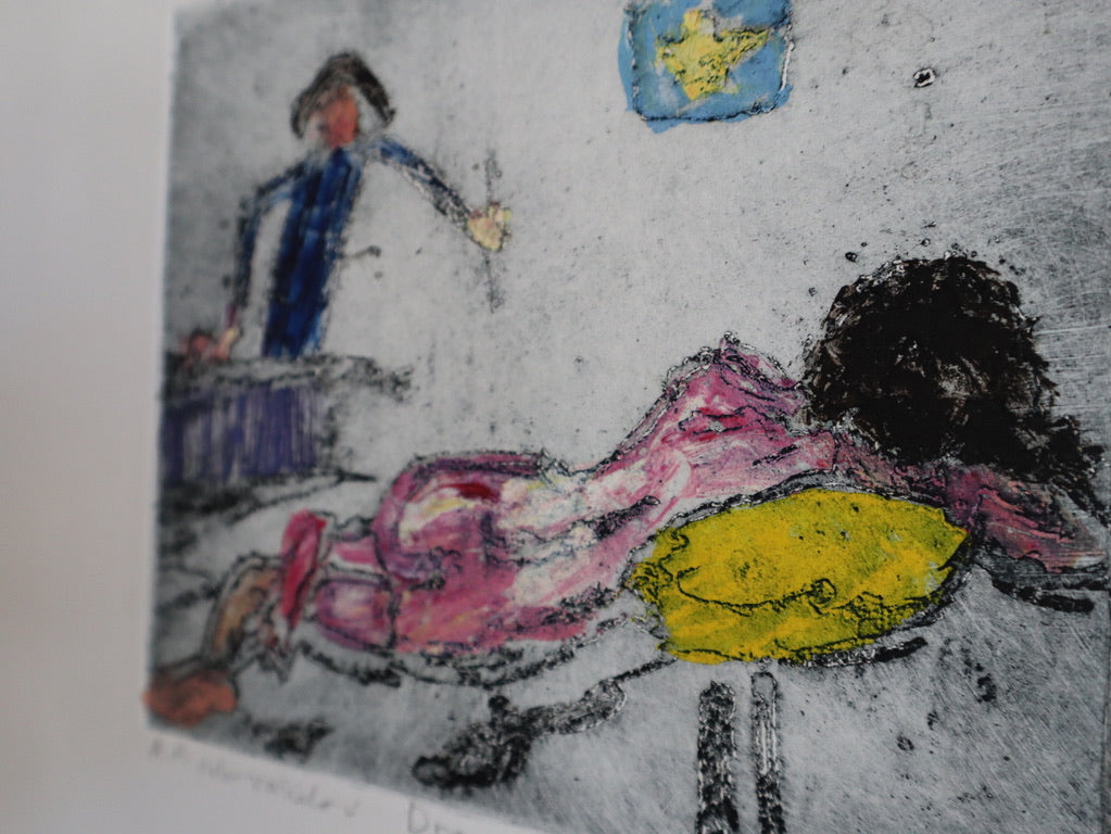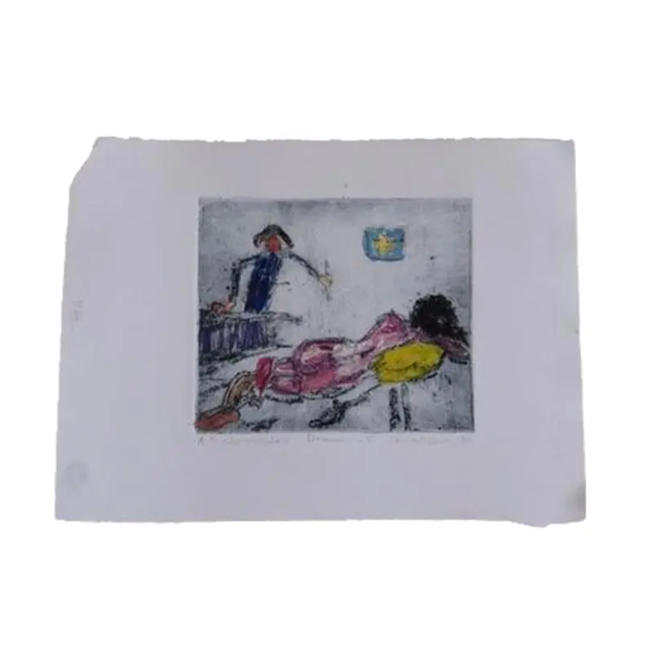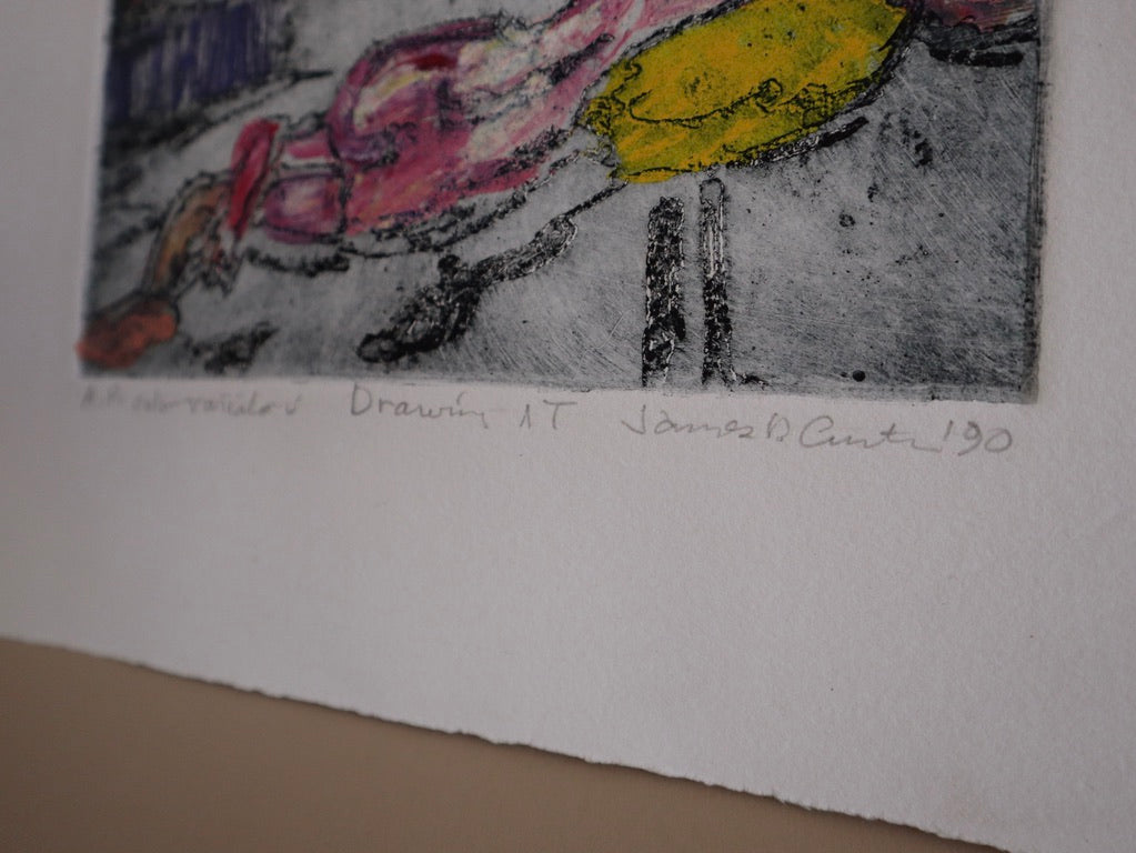 Vintage 1990 studio etching by artist James D. Curtis featuring a female figure lying down with an artist drawing in the distance. Light gray background with yellow, pink, green, and blue colors. Artist proof, date and signature in pencil by artist.