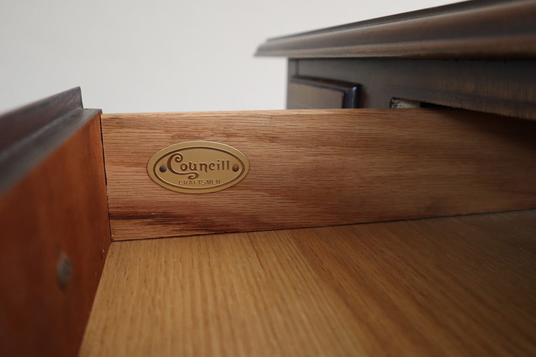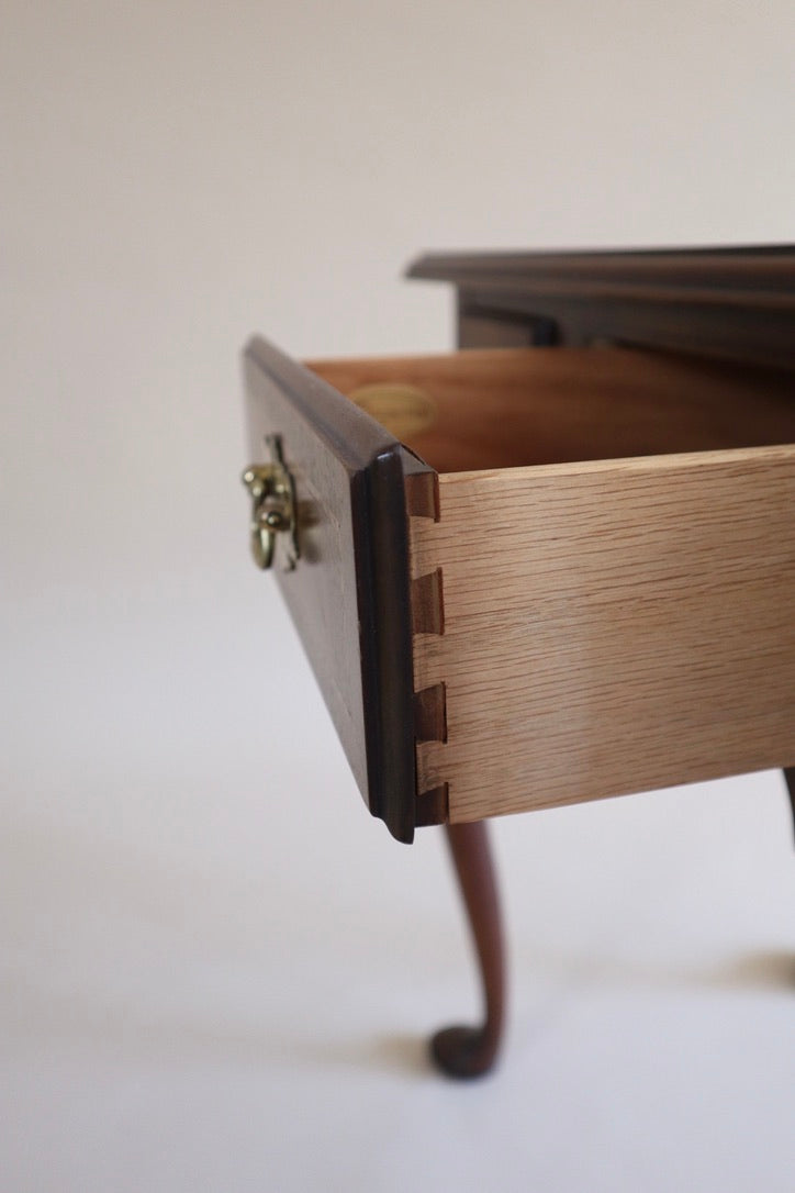 1990s Council Craftsman side table with 3 drawers. Pretty details such as Queen Anne legs, brass hardware, and wood inlay design framing drawers and table top.