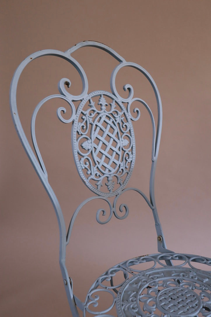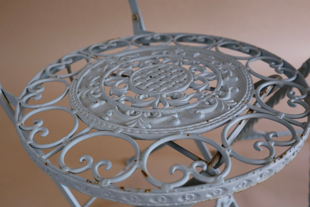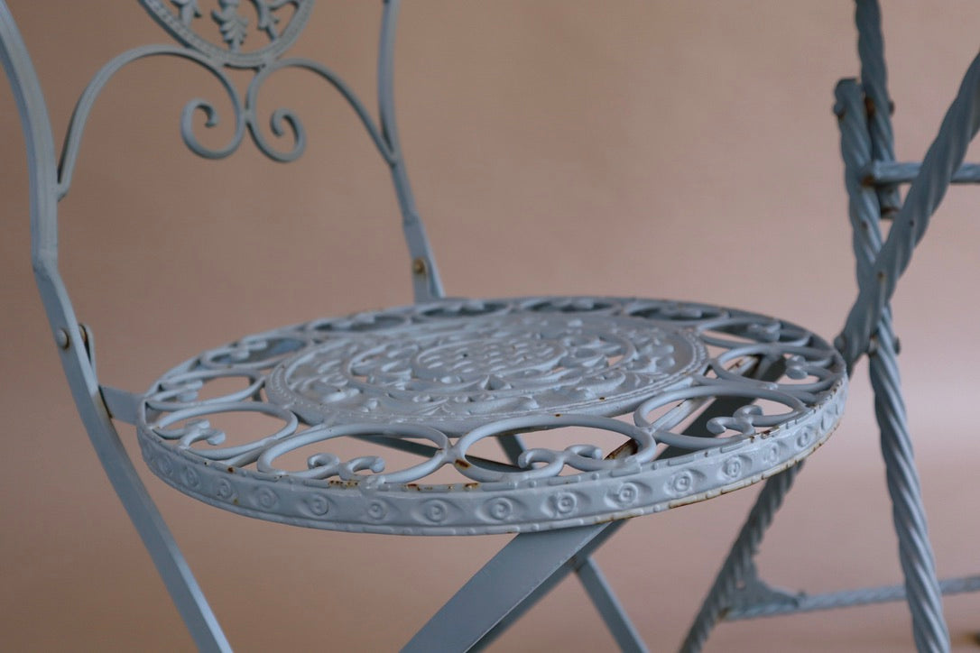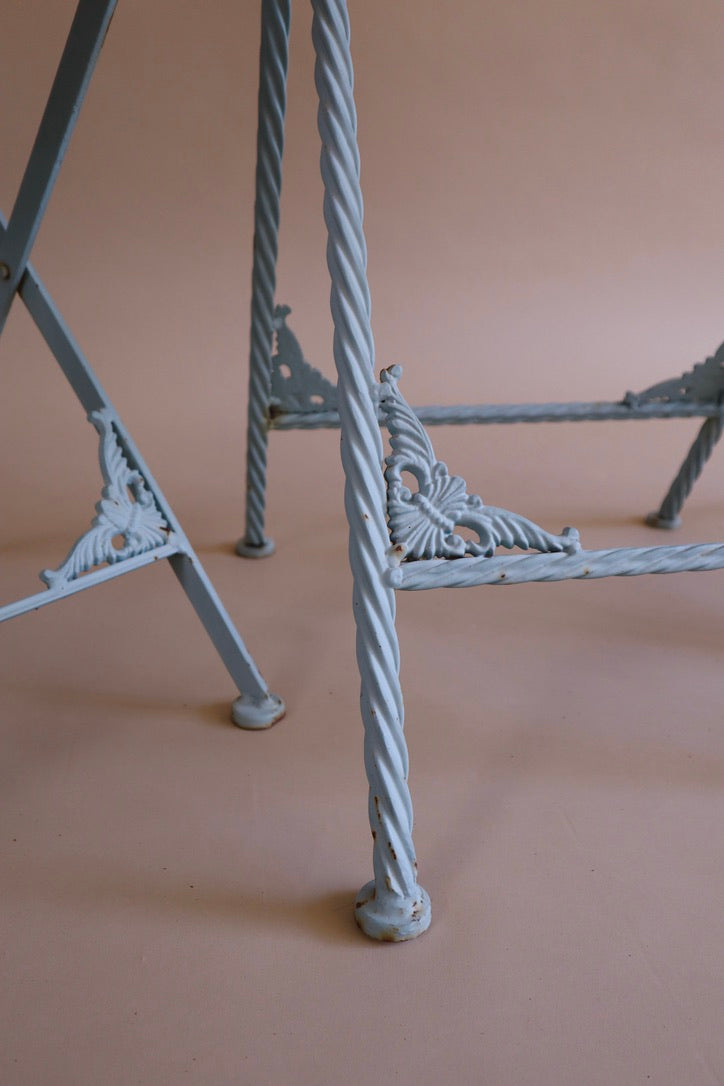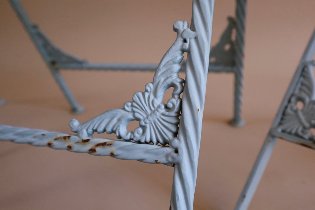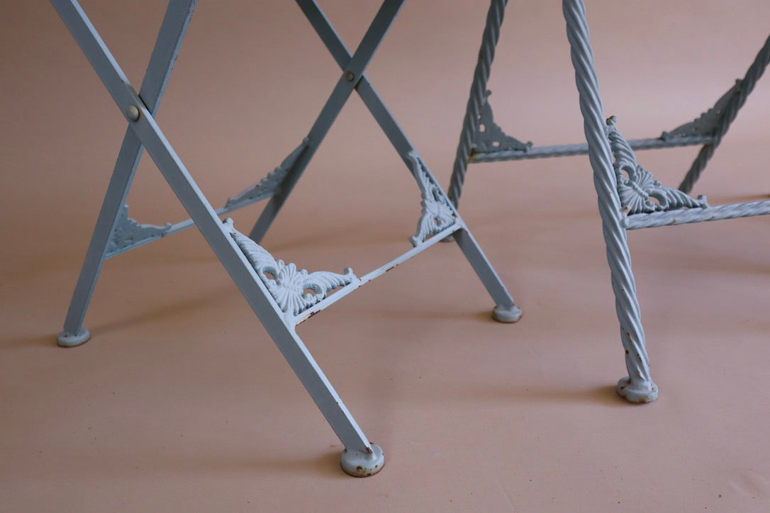 Absolutely charming minty blue antique French outdoor bistro set of (1) round folding table and (2) folding chairs. Decorated with pretty scrolls, foliage, round designs, and criss-cross picnic-type pattern. Table legs are elegant twisted form. Fully functional and sturdy set.