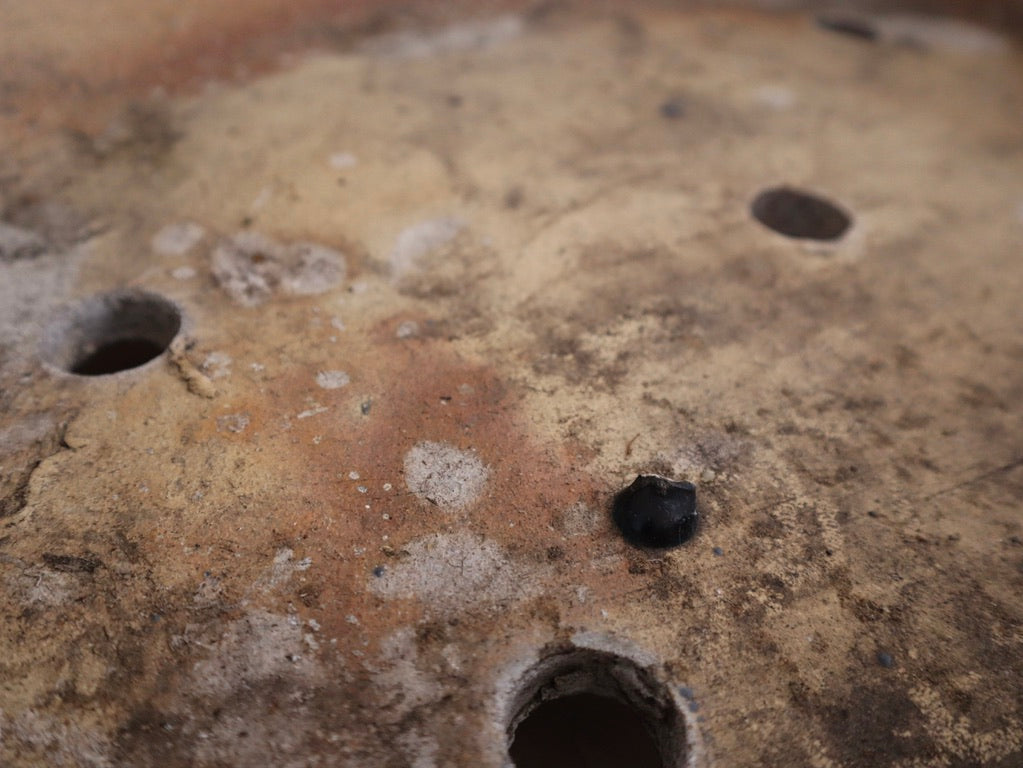 Large Shiwan blue glazed planter with studs formed all the way around. Includes (4) feet, and (5) drilled holes for water drainage.