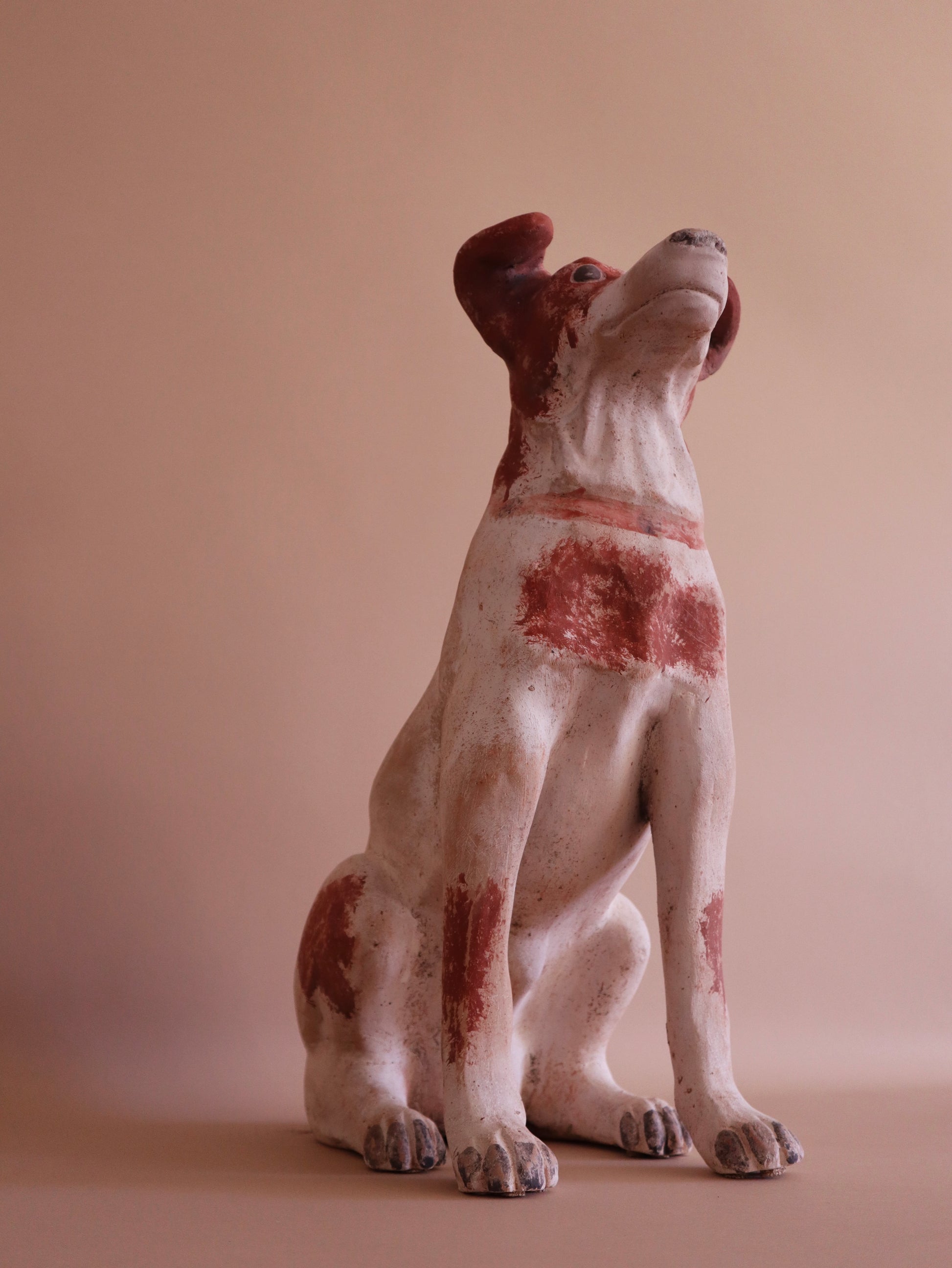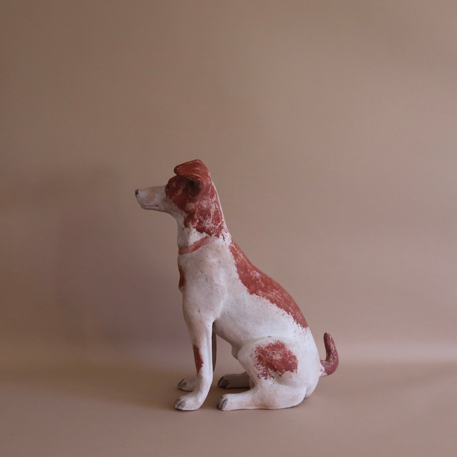Large vintage 1950s mid century ceramic Jack Russel Terrier. Sitting sweet with his ears and tail perked. White and rusty orange colors with faded red collar. Chalky paint finish.