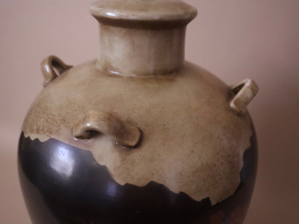 Vintage lamp depicting Japanese landscape with hand-painted red and blue florals. Accents of beige and seafoam green. Mounted on a black wood stand. Original Mid Century piece made by Marbro. No shade included.