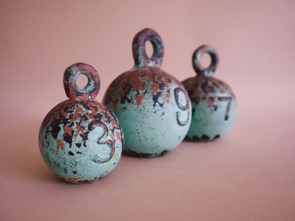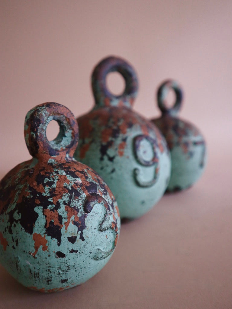 Set of (3) antique round iron scale weights. Attractive patina and graphic numbers on front and back - truly eye-catching objects of interest. Scales measure as follows: