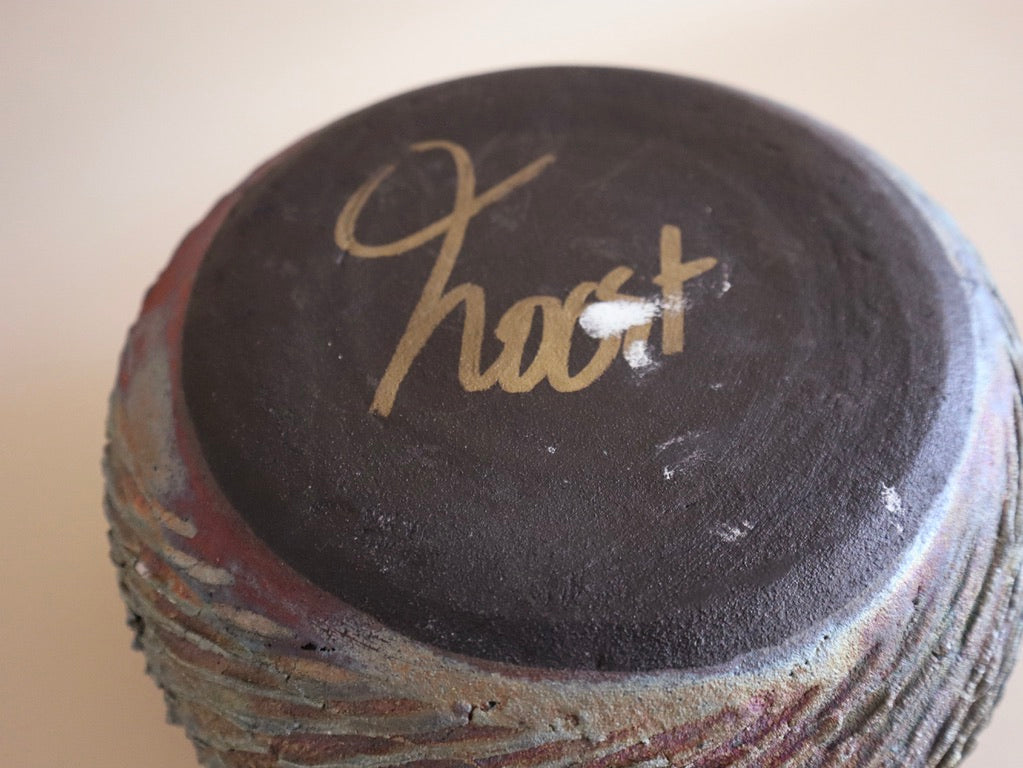 Beautiful 1990's textured vase by Hawaiian ceramic artist, Robbrecht Troost. Beautiful hues of teal, royal blue and bronze.