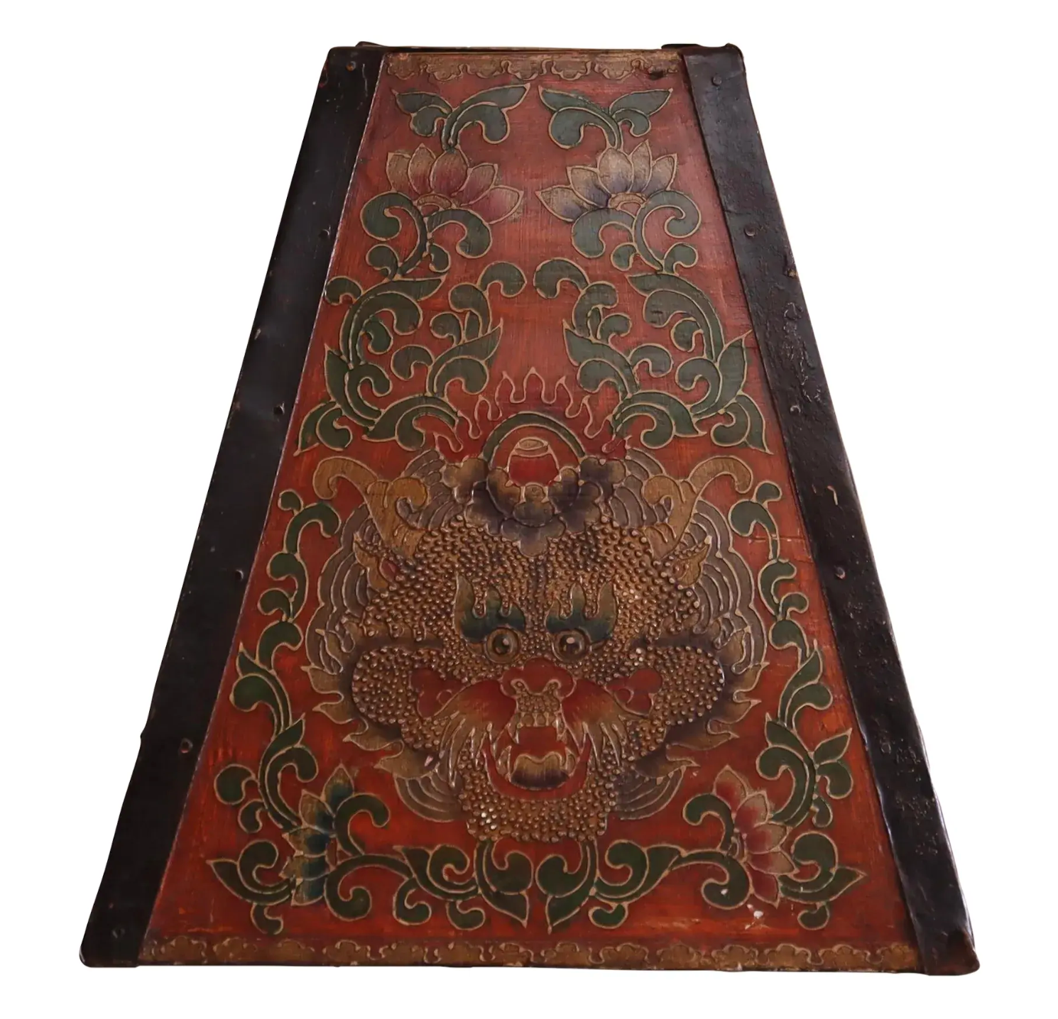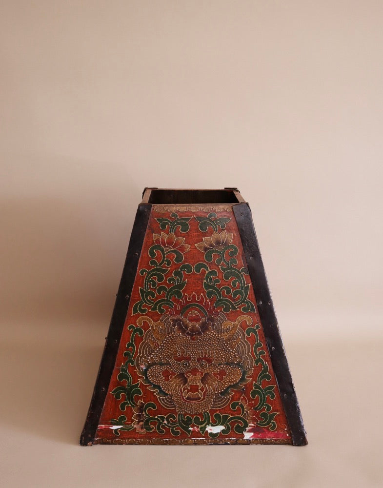 Vintage tapered wooden bucket decorated with metal dragons and floral designs. Red background with green and yellow accents. Wooden handle going across top of interior.